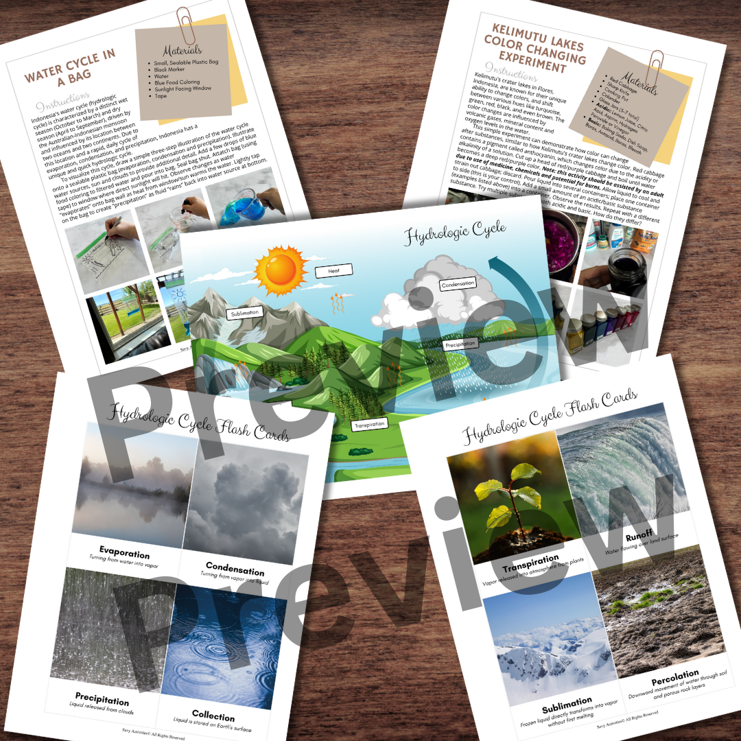 Hydrologic (Water) Cycle Experiment, Flash Cards, Poster & Water Color Changing Experiment