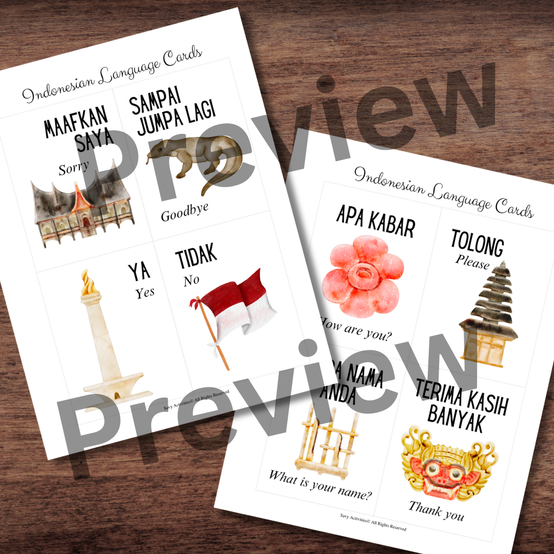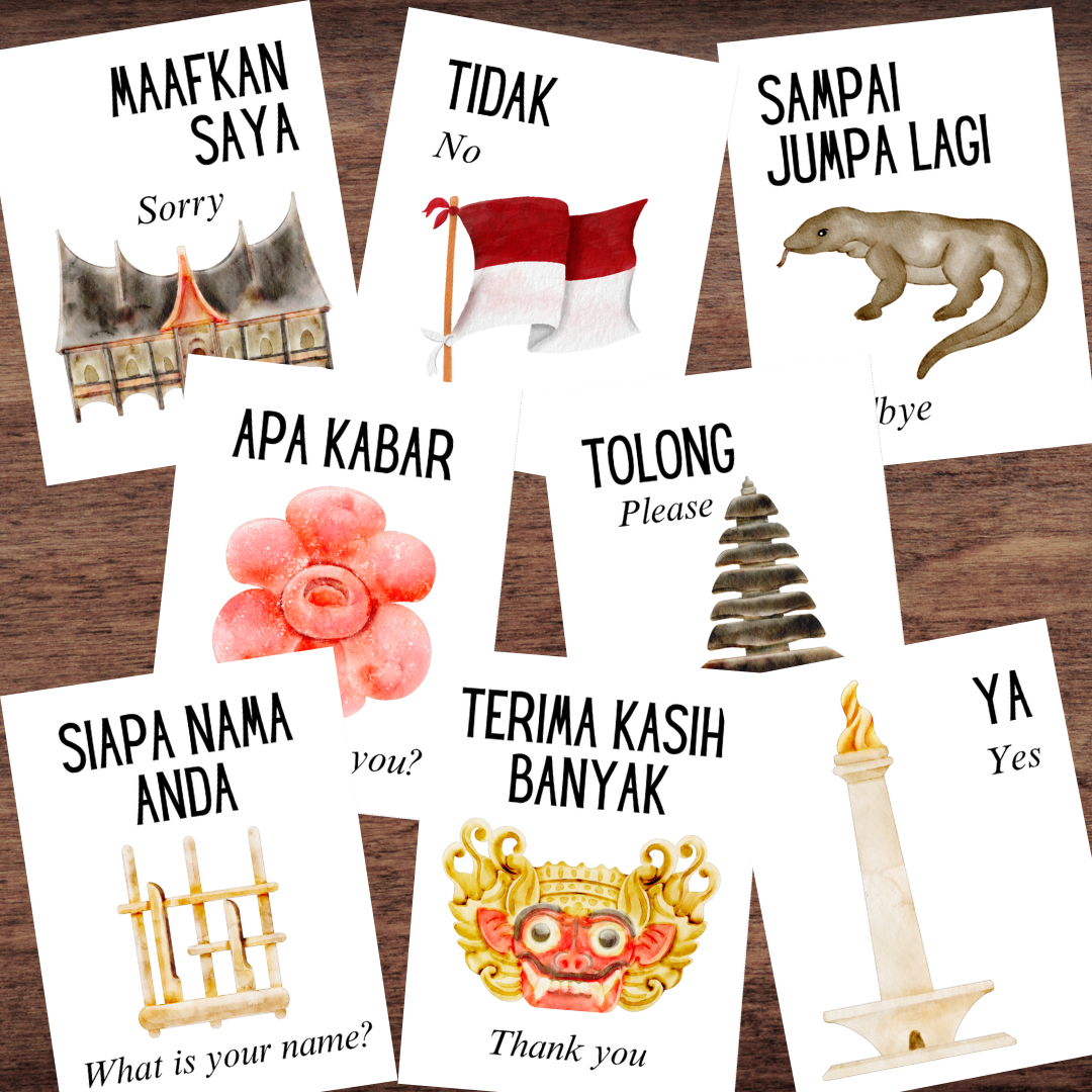 Learn basic phrases/words in Indonesia these full-color cards with an English equivalent. Great for learning about a Indonesia, Asia or part of a study on world languages.